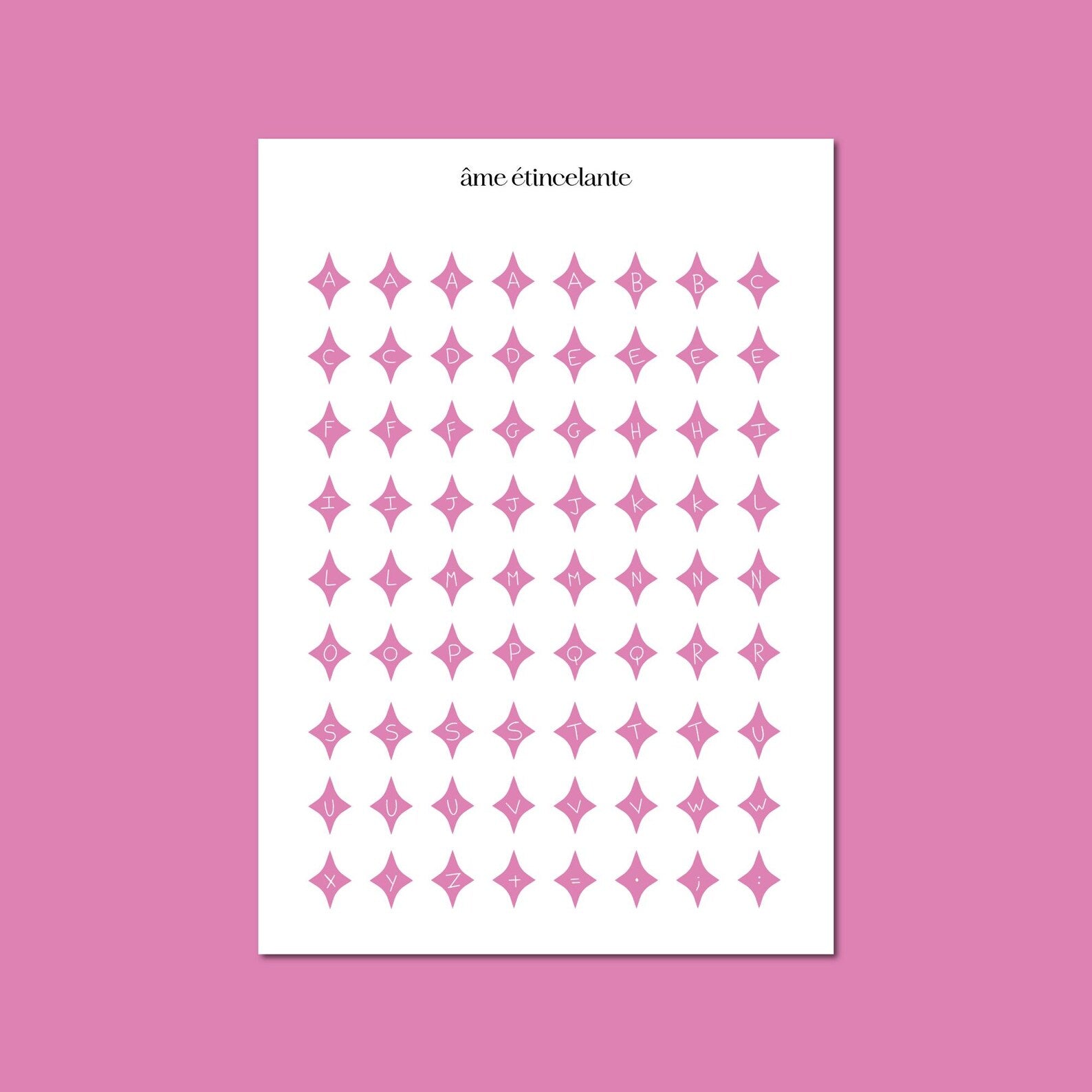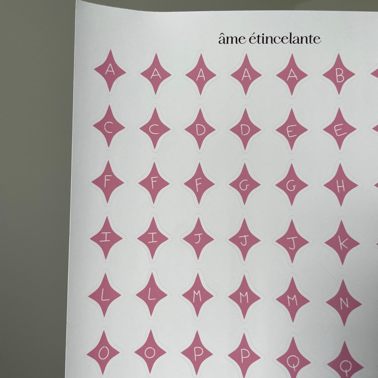 Planche de stickers alphabet sur le thème étoiles. Cette planche de stickers est imprimée sur un papier haute qualité de 120mg autocollant glossy pour un effet brillant.